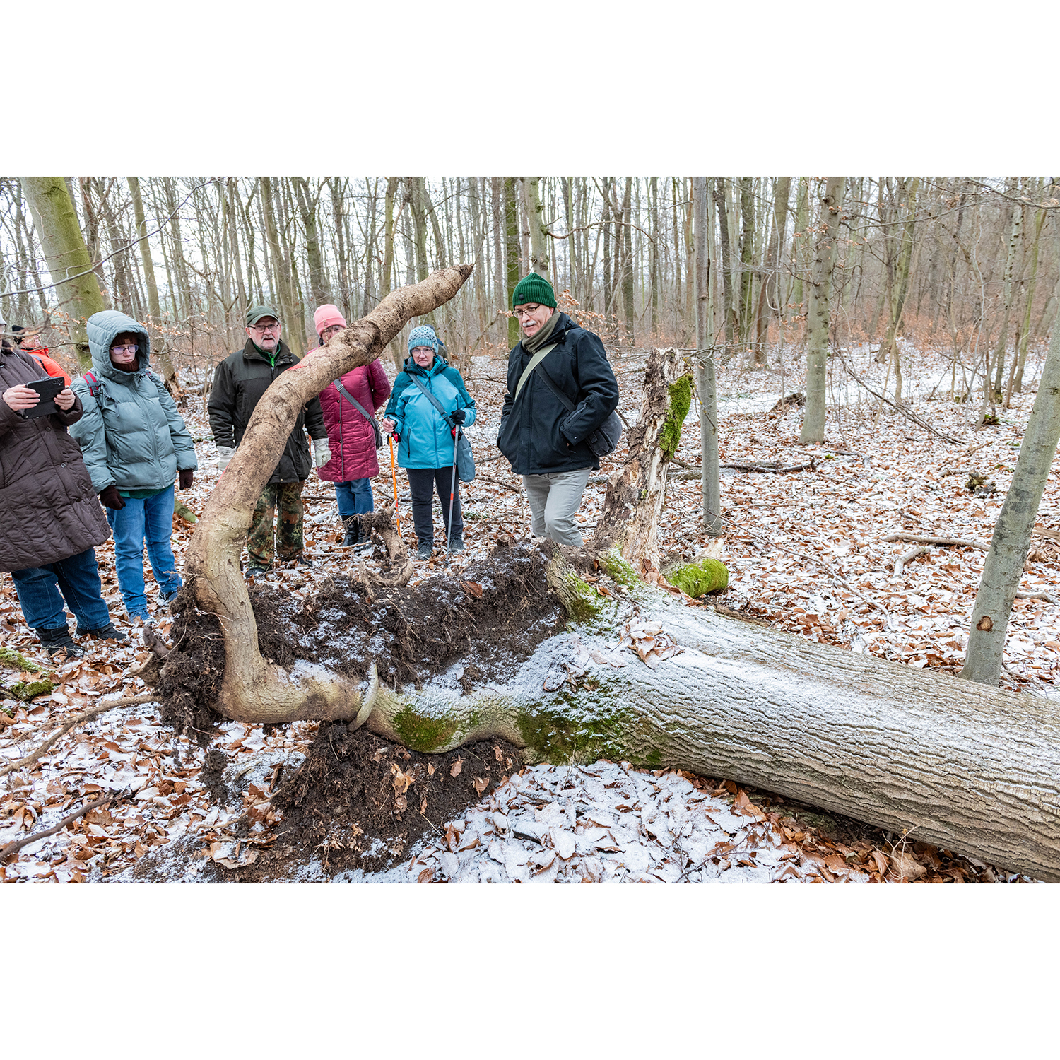 Umrahmt von einer leicht schneegeprägten Winterstimmung verwies der Vorsitzende des AHA Andreas Liste zu Beginn der ca. 5 km langen Exkursion auf die Bedeutung des vielfältigen Mischwaldgebietes, welches jeweils als ca. 1.366,00 ha große Landschafts- und Naturschutzgebiete Hakel, ca. 6.438,00 ha große Europäische Vogelschutzgebietes “Hakel“ (EU-Code: DE 4134-401, Landescode: SPA0005) sowie als ca. 1.340,00 ha großes Fauna-Flora-Habitat (FFH)-Gebietes “Hakel südlich Kroppenstedt“ (EU-Code: DE 4134-301, Landescode: FFH0052) ausgewiesen ist. Den Schutz, den Erhalt und die Entwicklung des Hakels mit seiner großen Artenvielfalt an Fauna, Flora und Funga gilt es nach Auffassung des Arbeitskreises Hallesche Auenwälder zu Halle (Saale) e.V. – AHA – ein umfassendes Maßnahmepaket anzugehen.